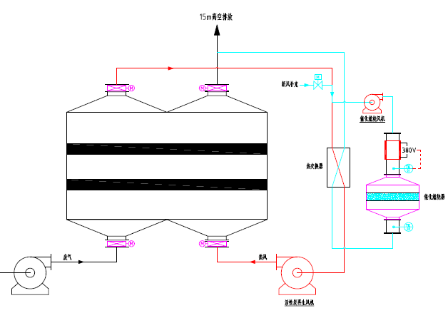 脫臭原理:將有臭味地氣體通過煙囪排至大氣,或用無臭空氣稀釋,降低惡臭物質(zhì)濃度以減少臭味。適用范圍:適用于處理中、低濃度的有組織排放的惡臭氣體。優(yōu)點:費用低、設(shè)備簡單。缺點:易受氣象條件限制,惡臭物質(zhì)依然存在。