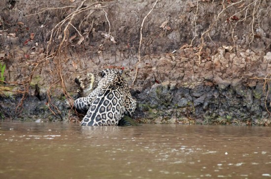 據(jù)英國《每日郵報》報道,近日,在巴西北潘塔納爾的一條小河岸邊,女導(dǎo)游利恩·吉利斯(Leen Gillis)拍攝到了一場長達(dá)20分鐘的精彩戰(zhàn)斗。