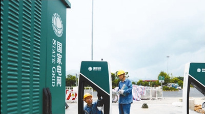7月22日,國網(wǎng)浙江杭州余杭區(qū)供電公司工作人員來到杭長高速徑山服務(wù)區(qū)內(nèi),為即將投運(yùn)的首批高速公路服務(wù)區(qū)電動汽車充電樁進(jìn)行調(diào)試。 |