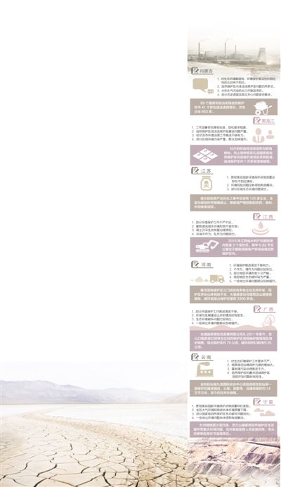 長(zhǎng)江江蘇段分布有30個(gè)集中式飲用水水源地,現(xiàn)場(chǎng)抽查12個(gè),8個(gè)存在環(huán)境違法問題;江西省水利廳亂作為,2015年在鄱陽湖批準(zhǔn)3個(gè)采砂區(qū),其中有6.82平方公里位于鄱陽湖銀魚產(chǎn)卵場(chǎng)省級(jí)自然保護(hù)區(qū)內(nèi);河南2015年全省PM10、PM2.5濃度在全國(guó)31個(gè)省(區(qū)、市)排名分別位列第三和第一,2016年上半年,均位列全國(guó)第二;2012年至2014年,江西省樂平市政府違反《排污費(fèi)征收使用管理?xiàng)l例》,居然多次用財(cái)政資金為36家企業(yè)代繳排污費(fèi)1147萬元。